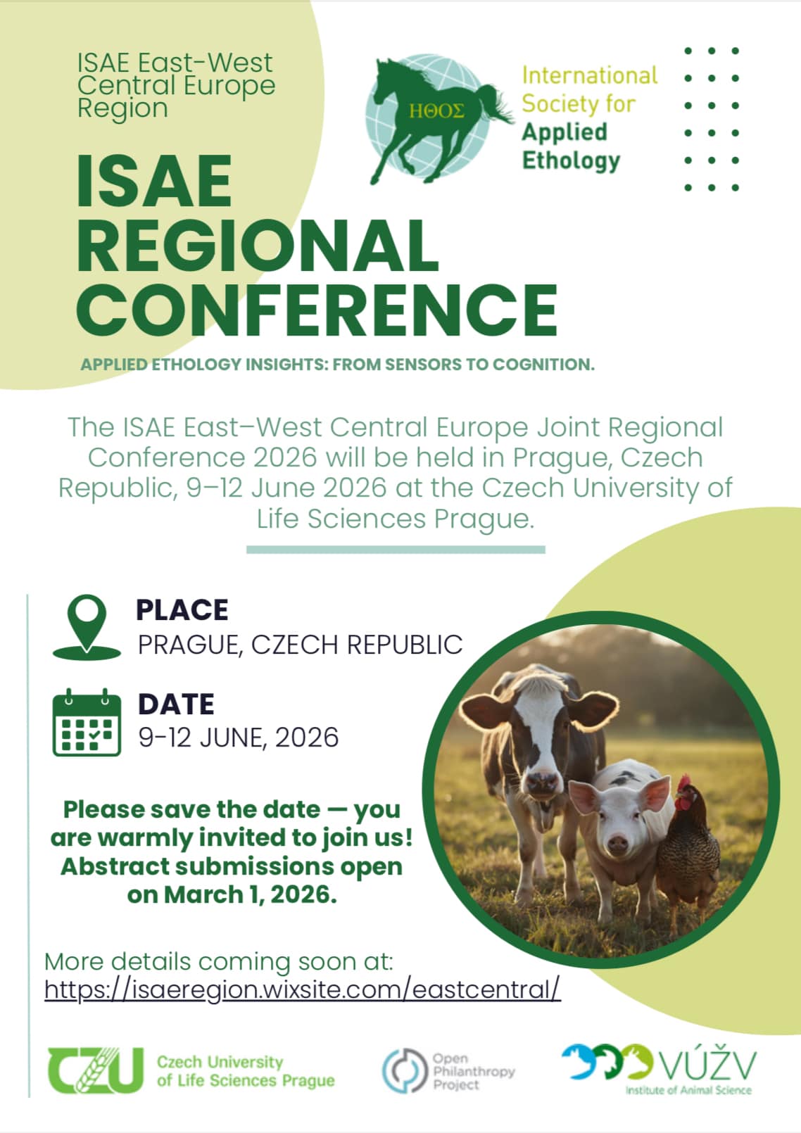 We are pleased to invite you to the ISAE East–West Central Europe Joint Regional Conference 2026, which will take place 9–12 June 2026 in Prague, Czech Republic. The conference is organised under the auspices of the International Society for Applied Ethology (ISAE) and will focus on current topics in applied ethology, animal welfare, behaviour of both domestic and wild species, research technologies, and animal cognition.